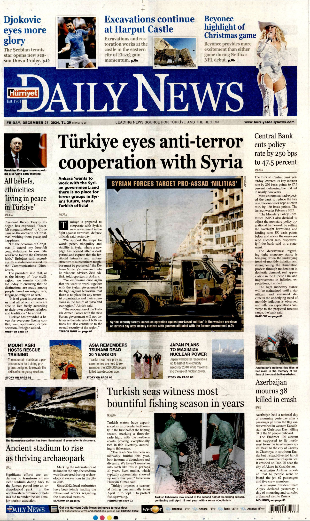 HÜRRİYET DAİLY NEWS Gazetesi 27 Aralık 2024, Cuma Günü Manşeti