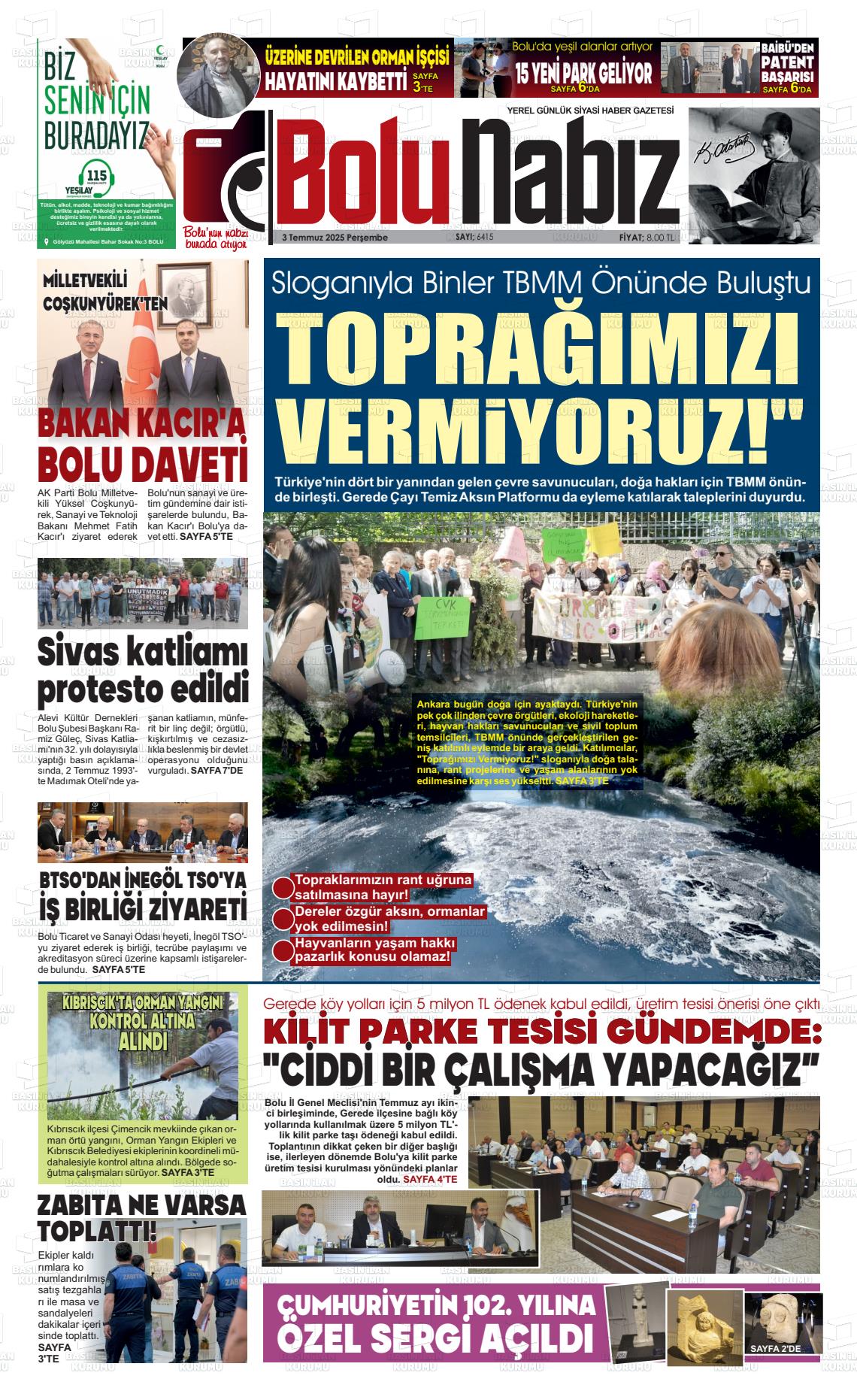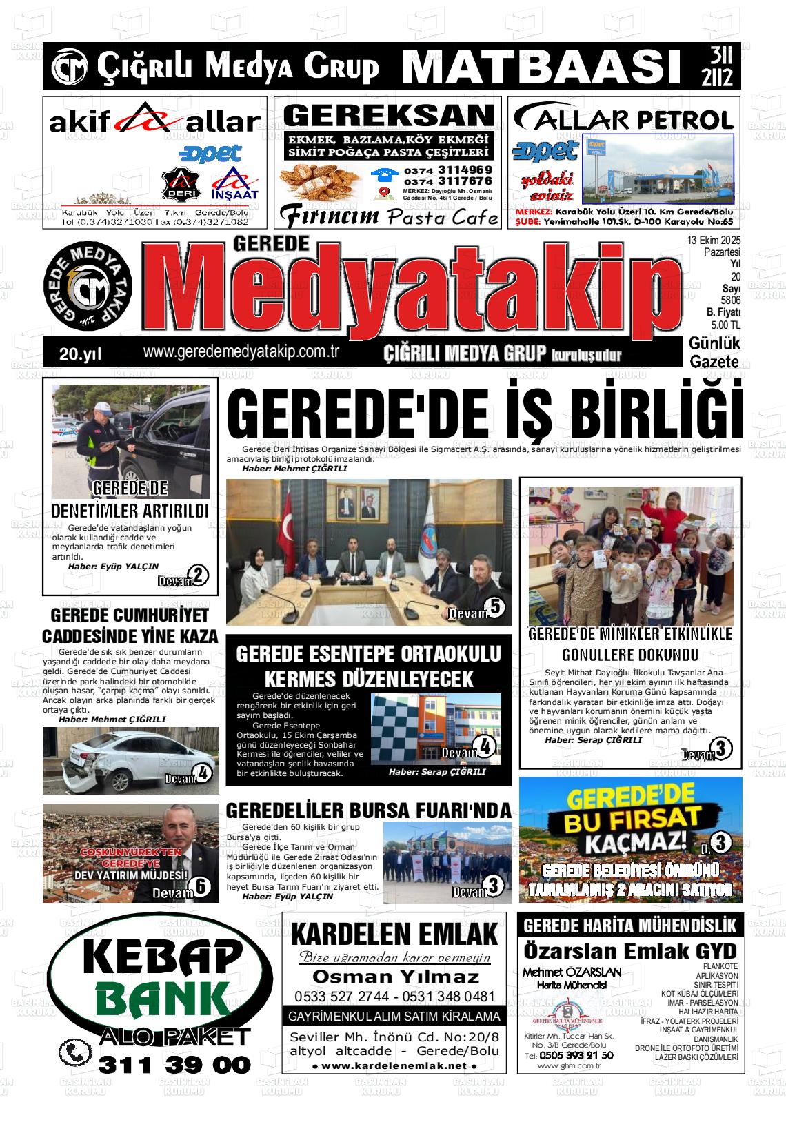 Bolu Yerel Gazeteleri 13 Ekim 2025, Pazartesi Günü Manşeti