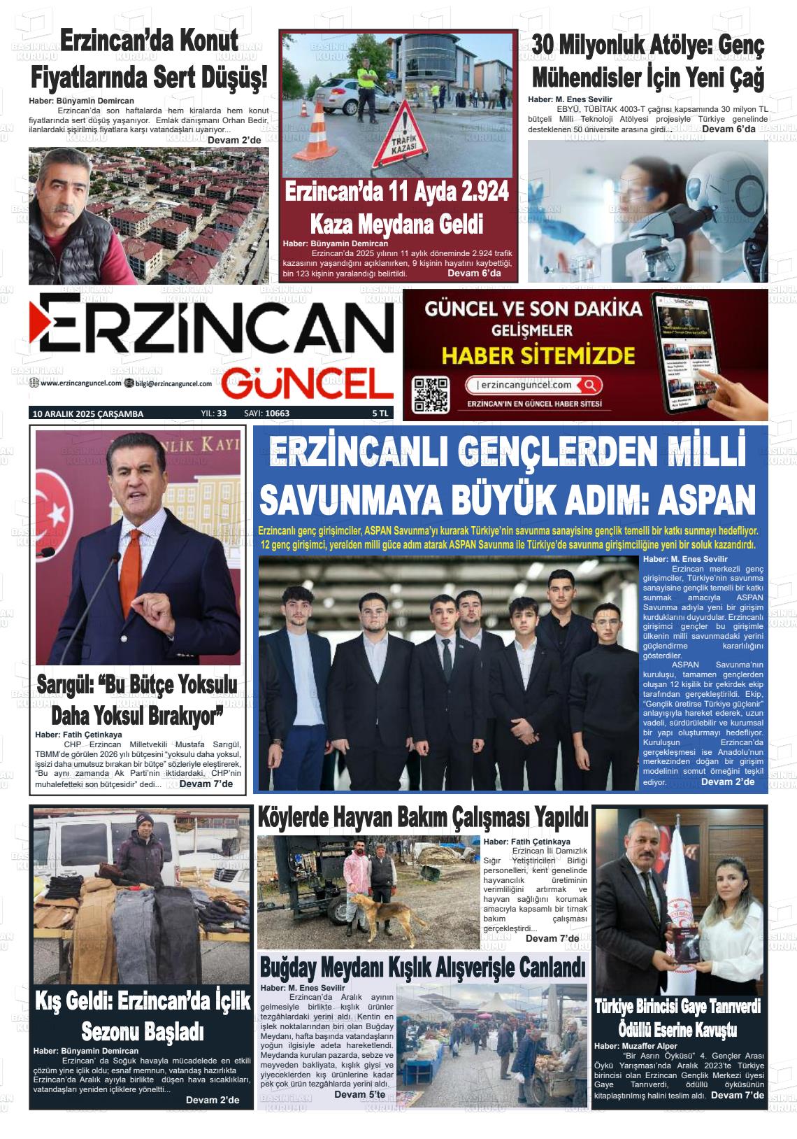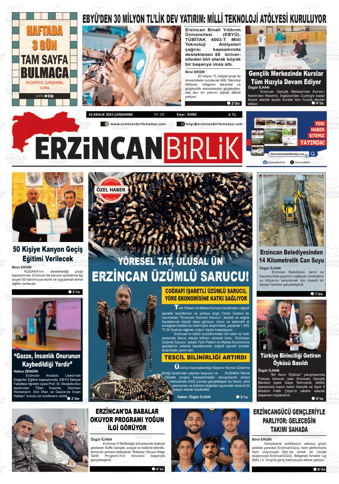 Erzİncan Yerel Gazeteleri 09 Aralık 2025, Salı Günü Manşeti