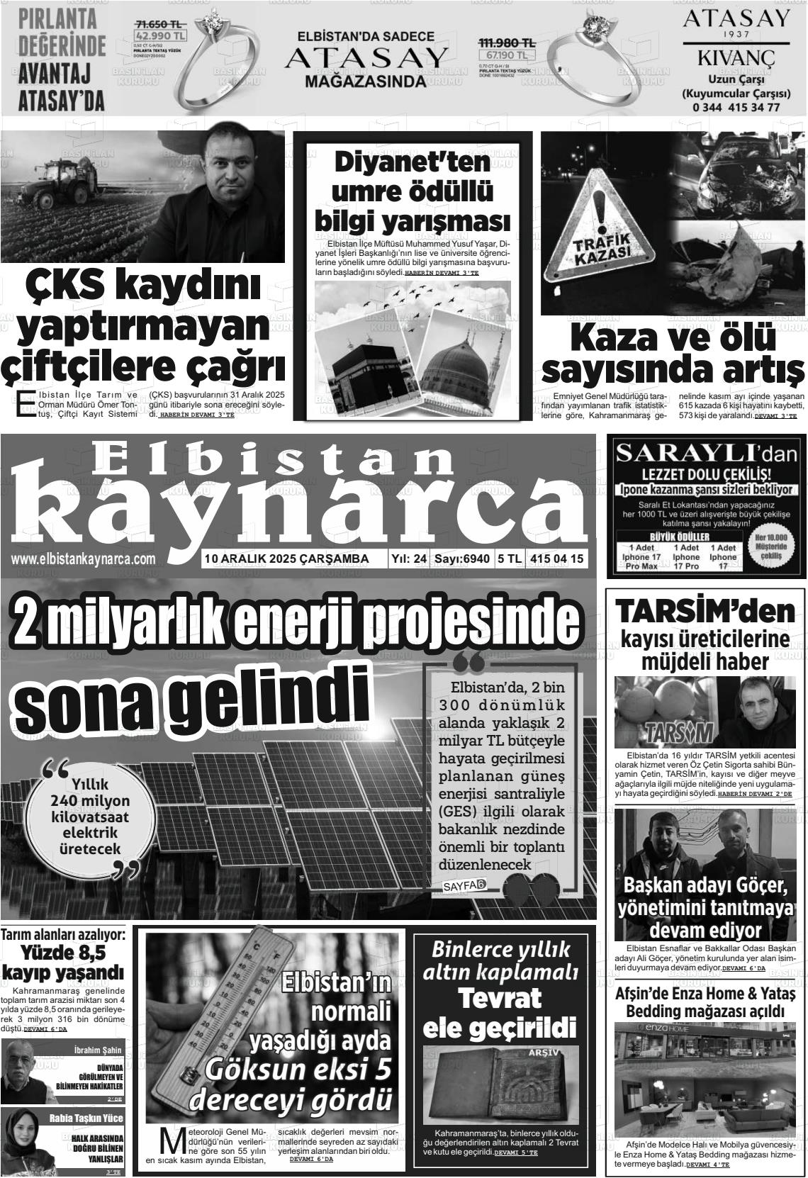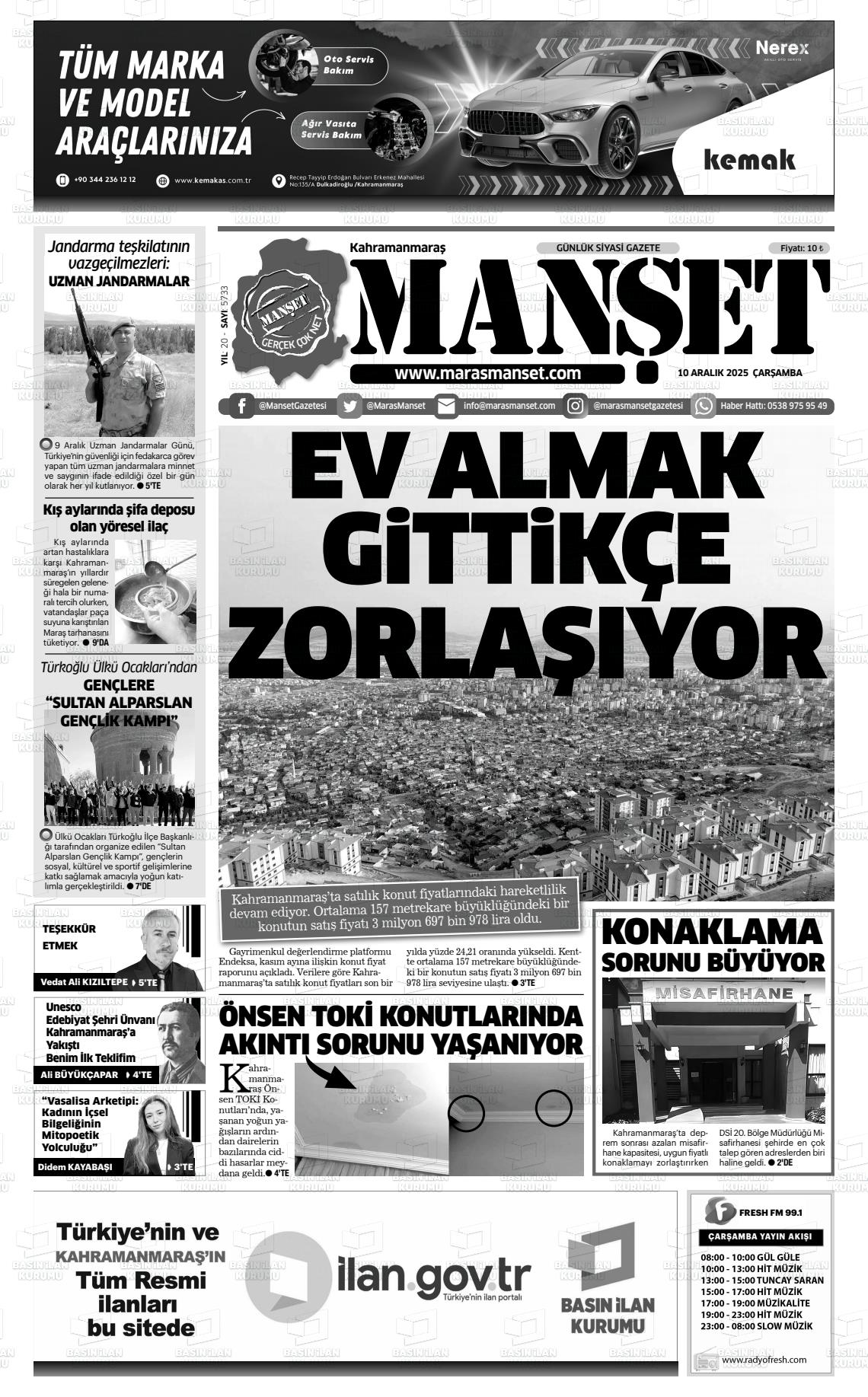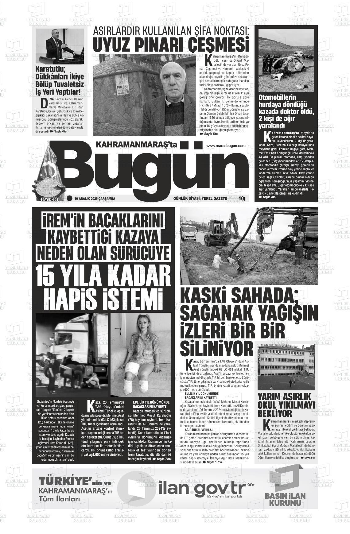Kahramanmaraş Yerel Gazeteleri 09 Aralık 2025, Salı Günü Manşeti