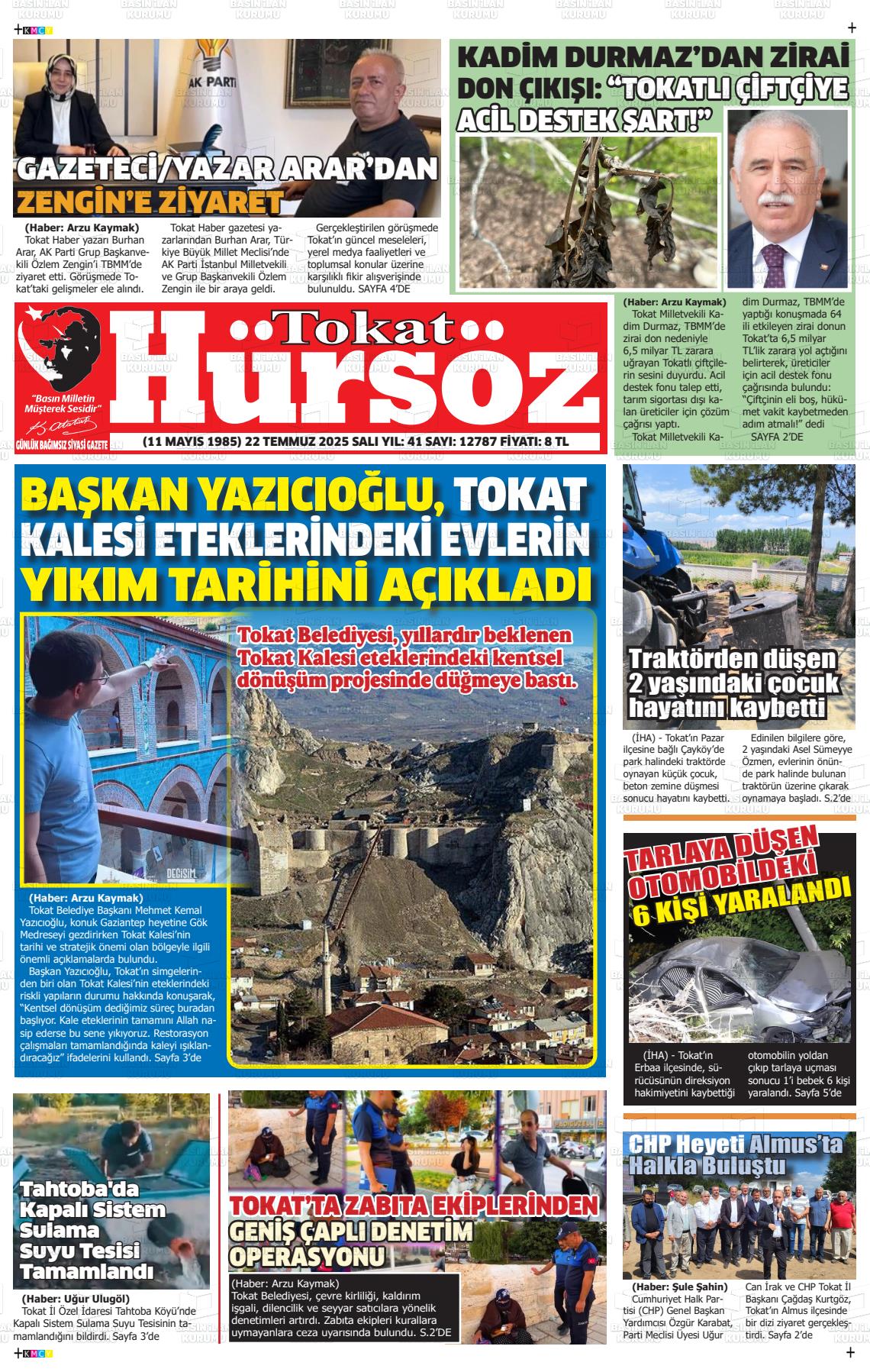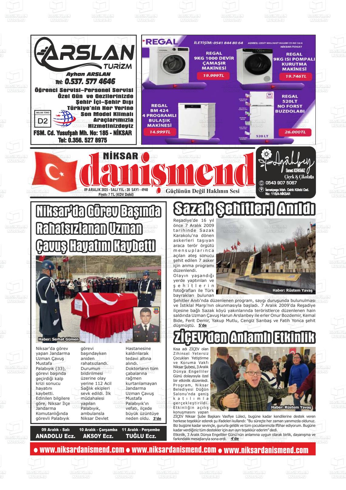 Tokat Yerel Gazeteleri 09 Aralık 2025, Salı Günü Manşeti